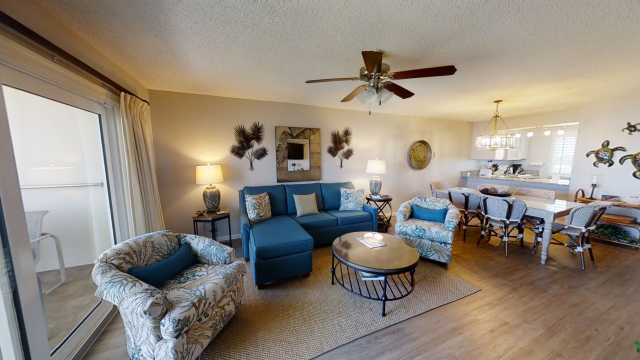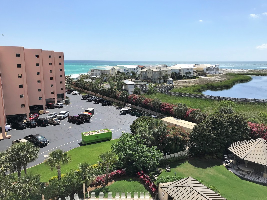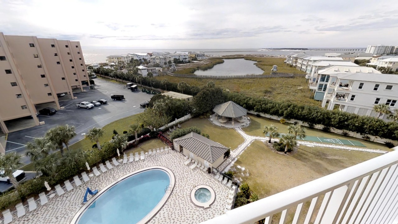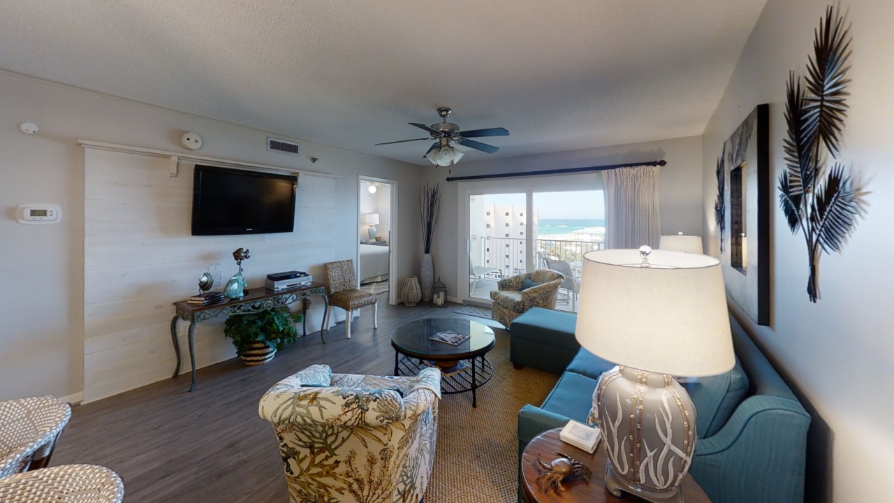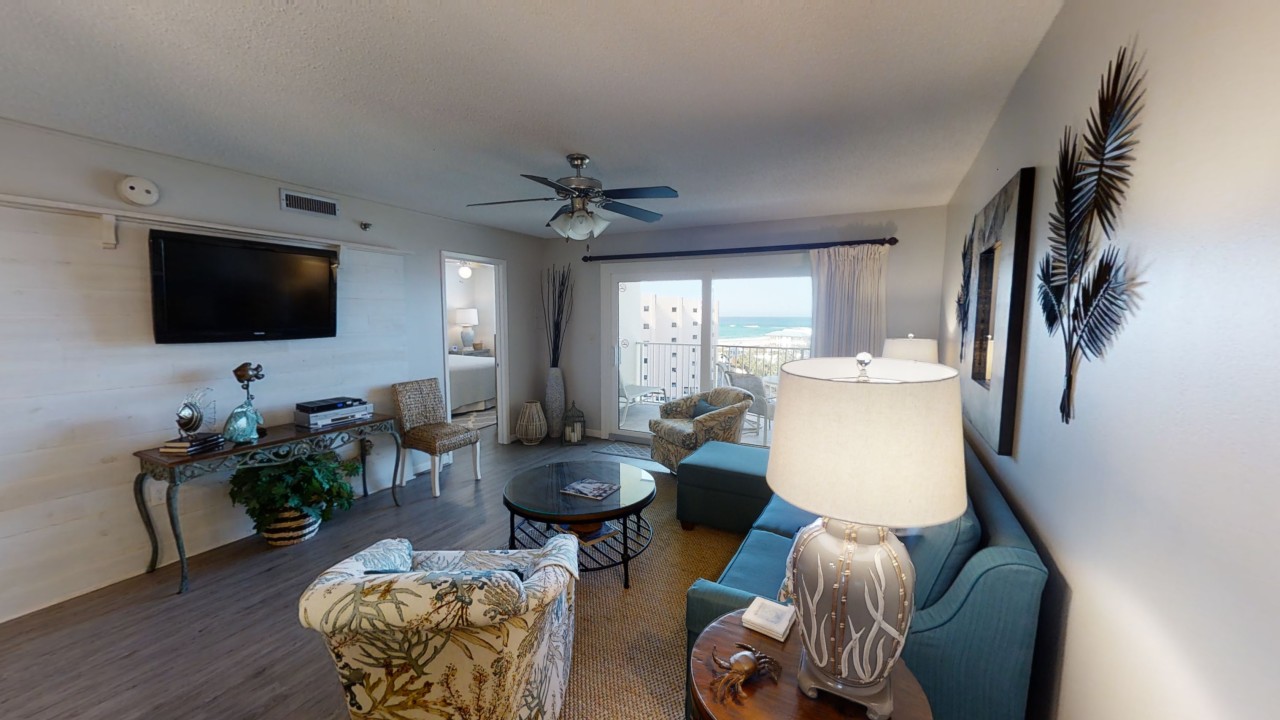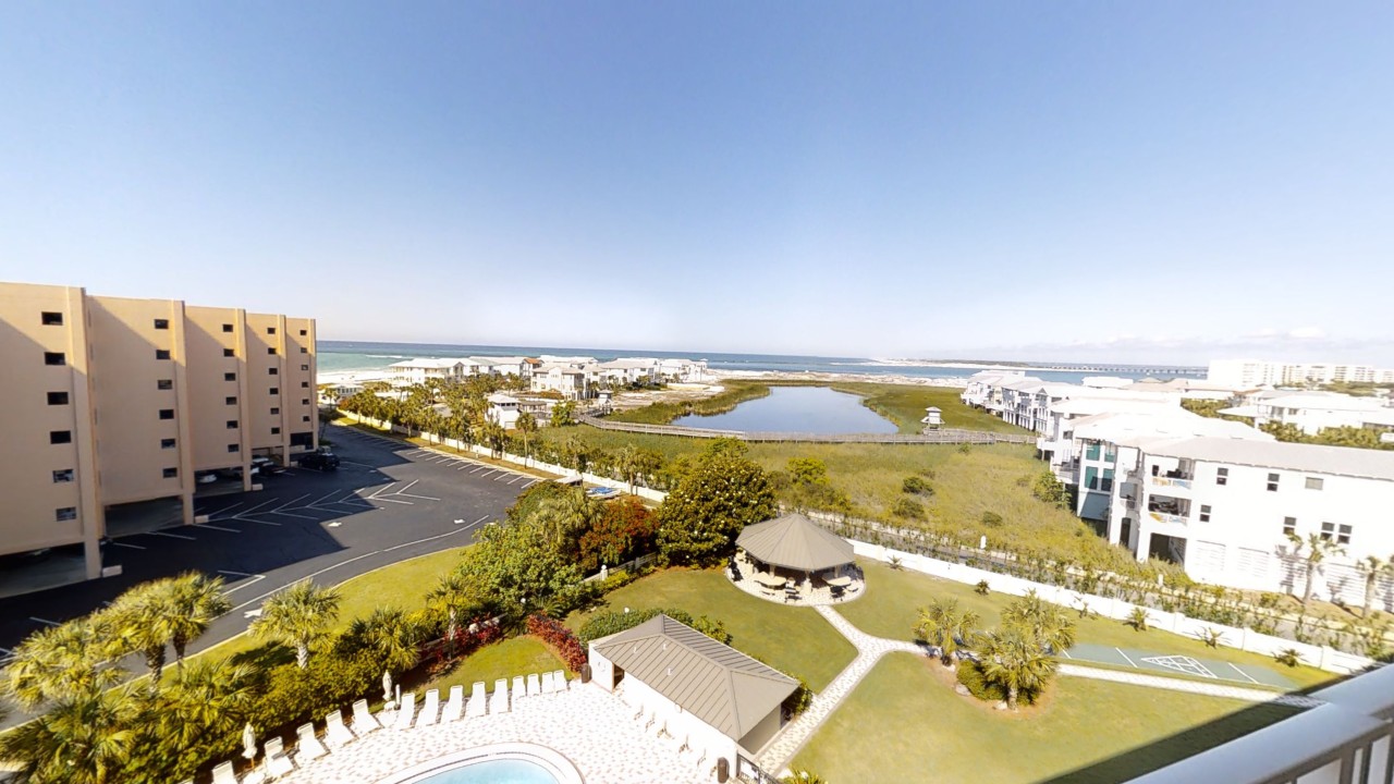 To preserve the quality, this unit only rents during the late spring/summer season. This beach front vacation condo rental is located in Destin Florida along the Emerald Coast. Unit 713 accommodates up to 6 people with a king in the master bedroom, 2 extra-long twin beds in the guest bedroom 24' TV, and a queen sleeper sofa in the living room 42' TV. This unit has vinyl wood plank flooring throughout. The west view from the private balcony features water, coastline, and beautiful sunsets all year. All units are non-smoking.