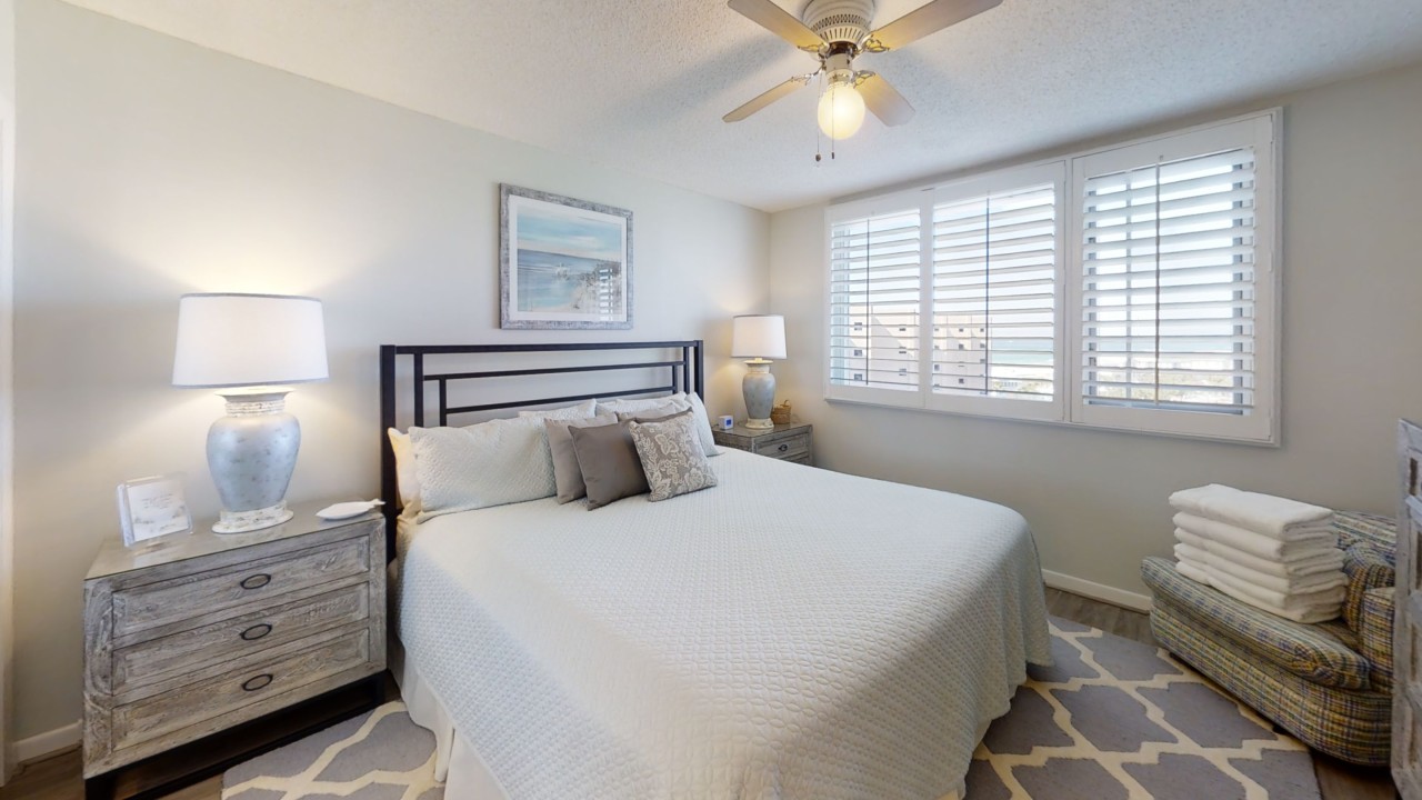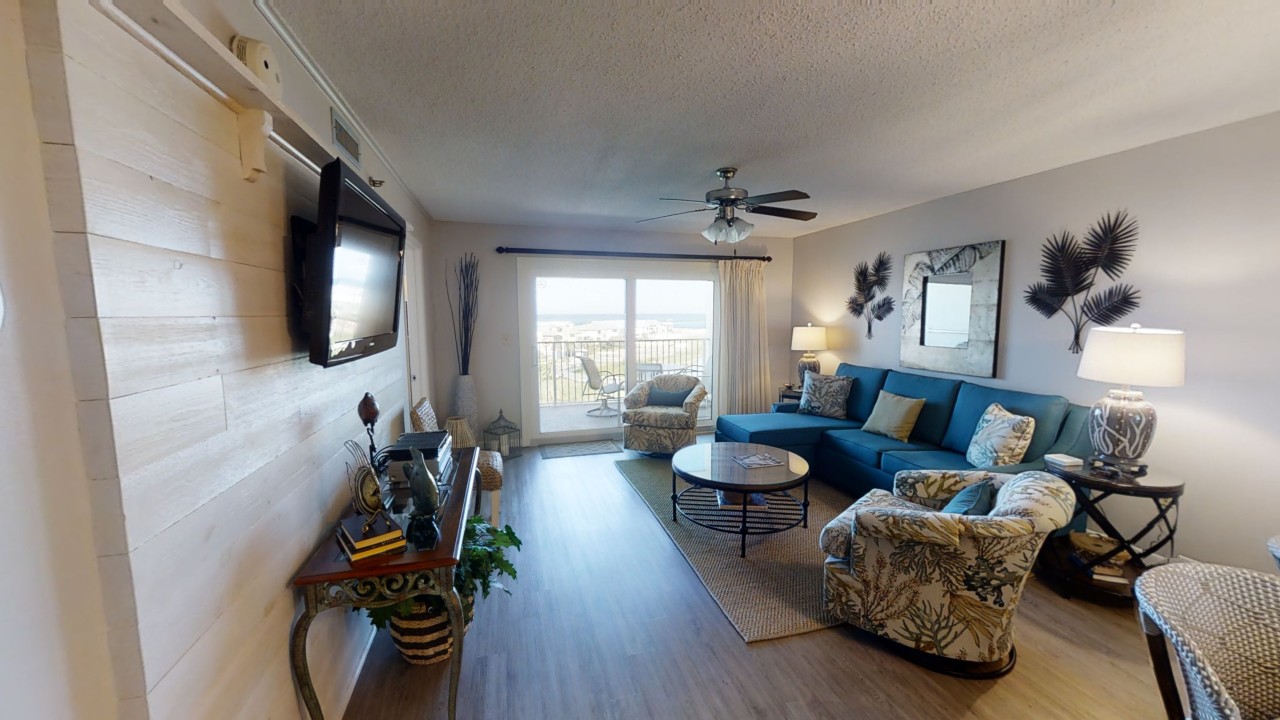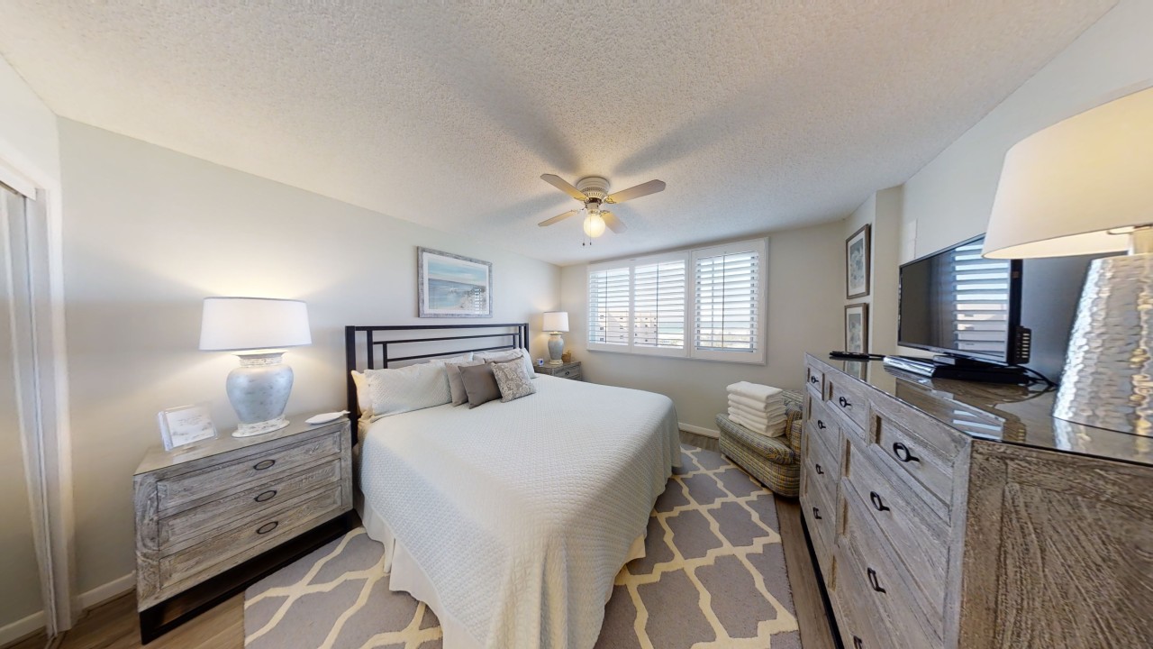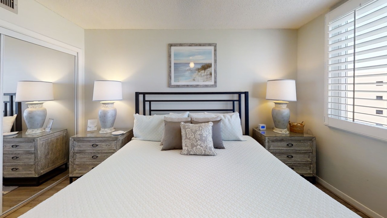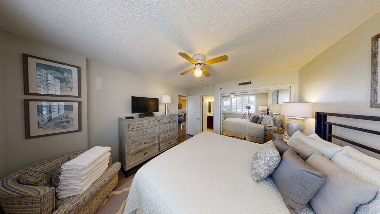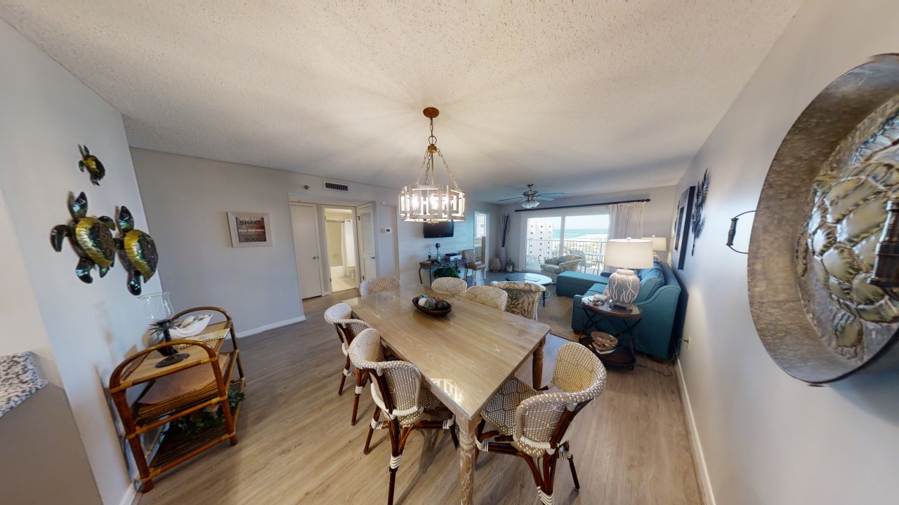 To preserve the quality, this unit only rents during the late spring/summer season. This beach front vacation condo rental is located in Destin Florida along the Emerald Coast. Unit 713 accommodates up to 6 people with a king in the master bedroom, 2 extra-long twin beds in the guest bedroom 24' TV, and a queen sleeper sofa in the living room 42' TV. This unit has vinyl wood plank flooring throughout. The west view from the private balcony features water, coastline, and beautiful sunsets all year. All units are non-smoking.