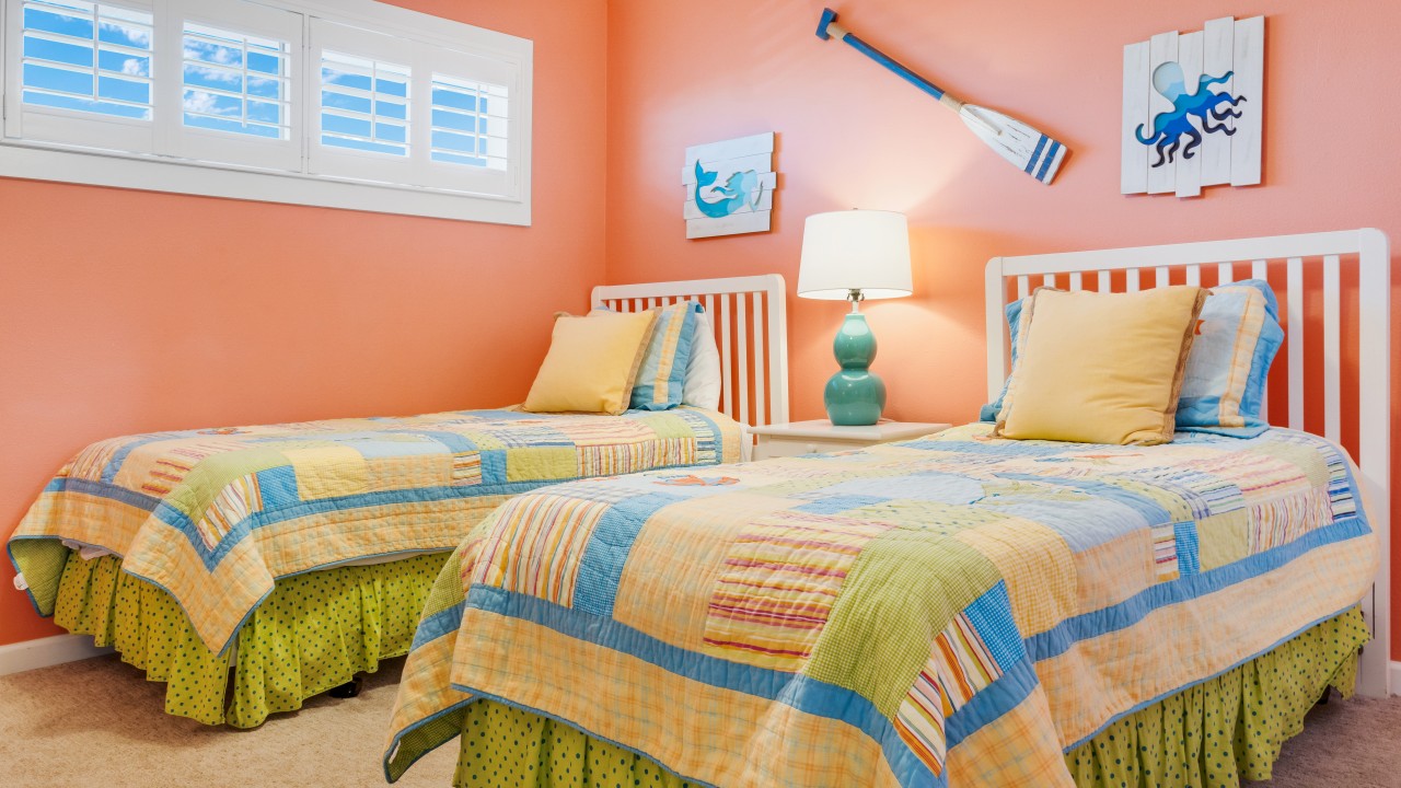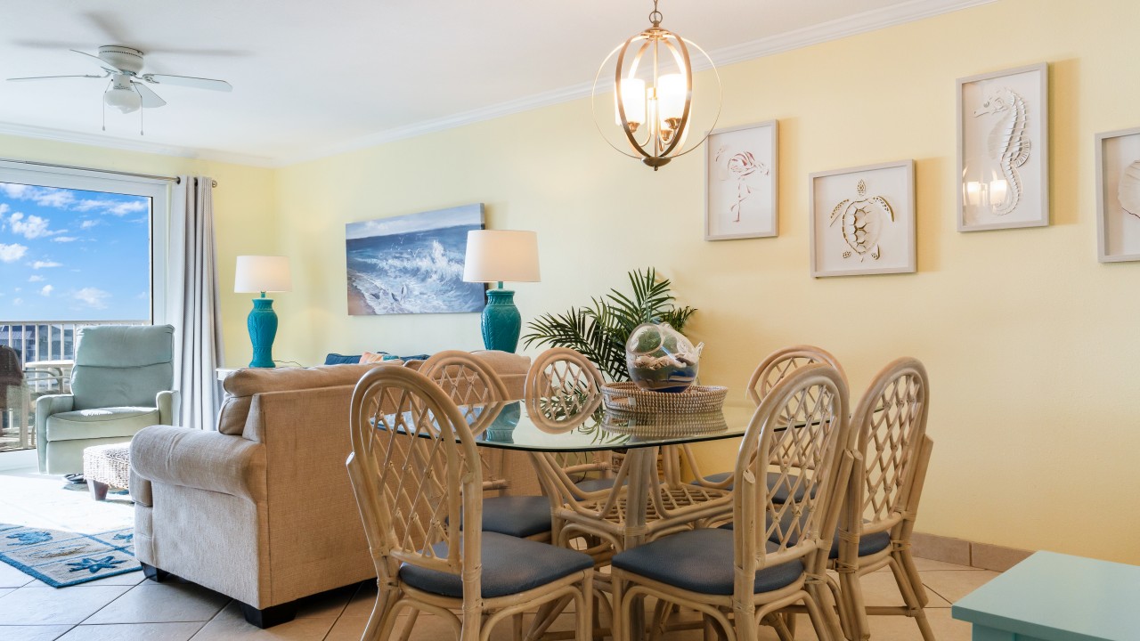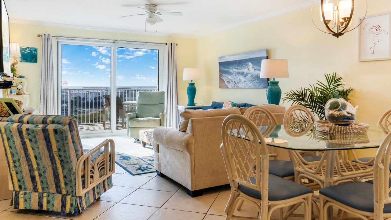 This beach front vacation condo rental is located in Destin Florida along the Emerald Coast. Condo rental #614 accommodates up to 6 people with a king in the master bedroom, 2 twins in the guest bedroom, and a sleeper sofa in the living room. Destin's Beach is just steps away with a beautiful view from your private balcony. All units are non-smoking.