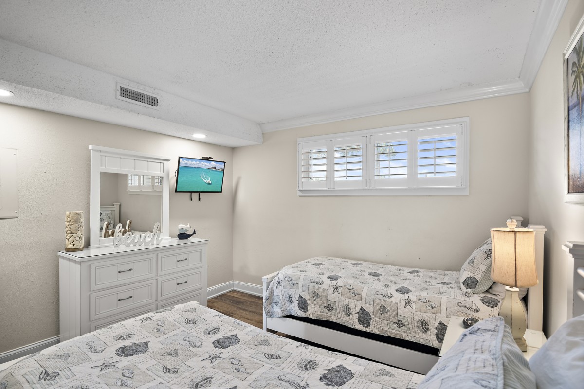 Guest Bedroom: This cozy space has two twin beds and an 18” flat-screen HDTV, with easy access to the guest bathroom that also includes a combination tub/shower.