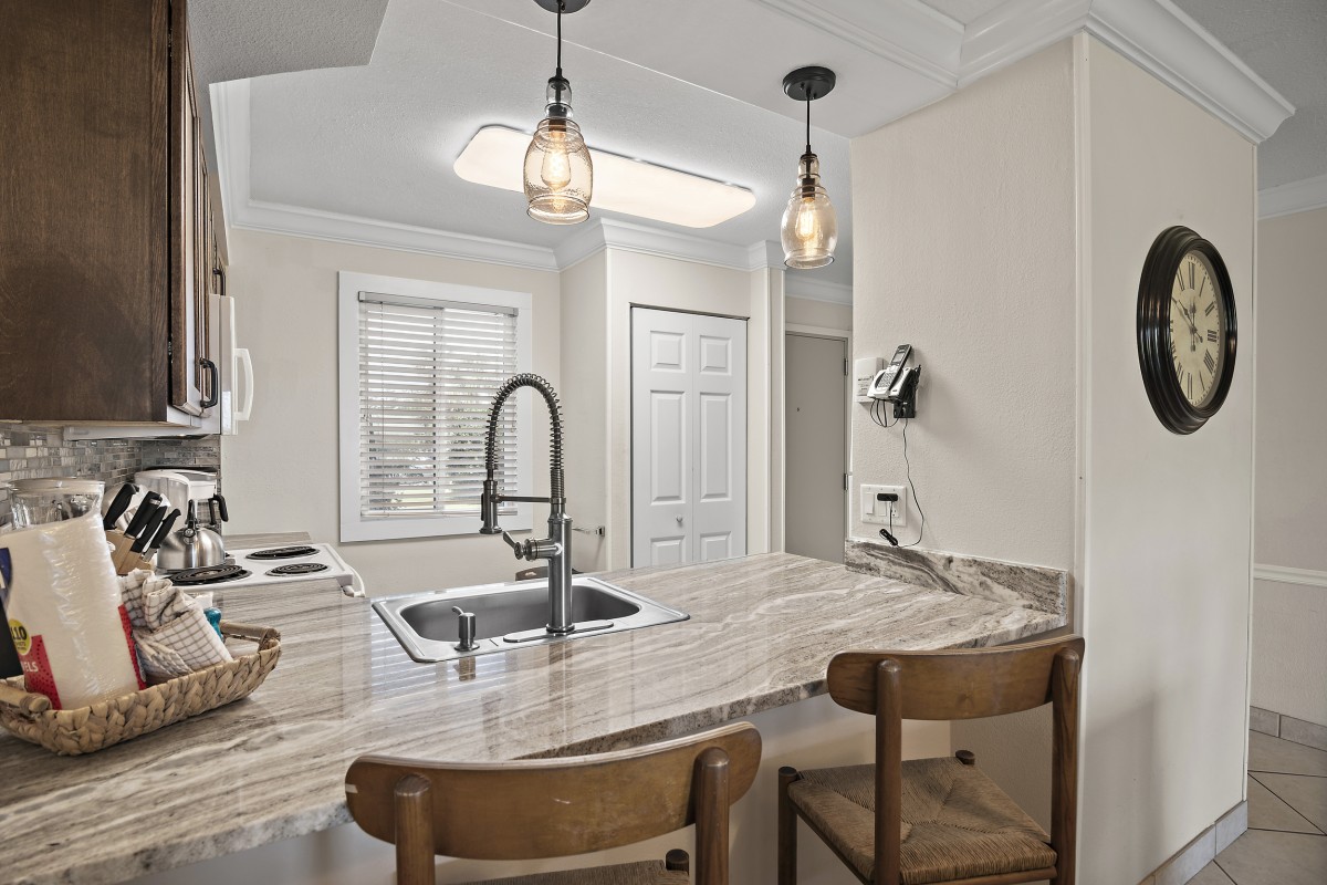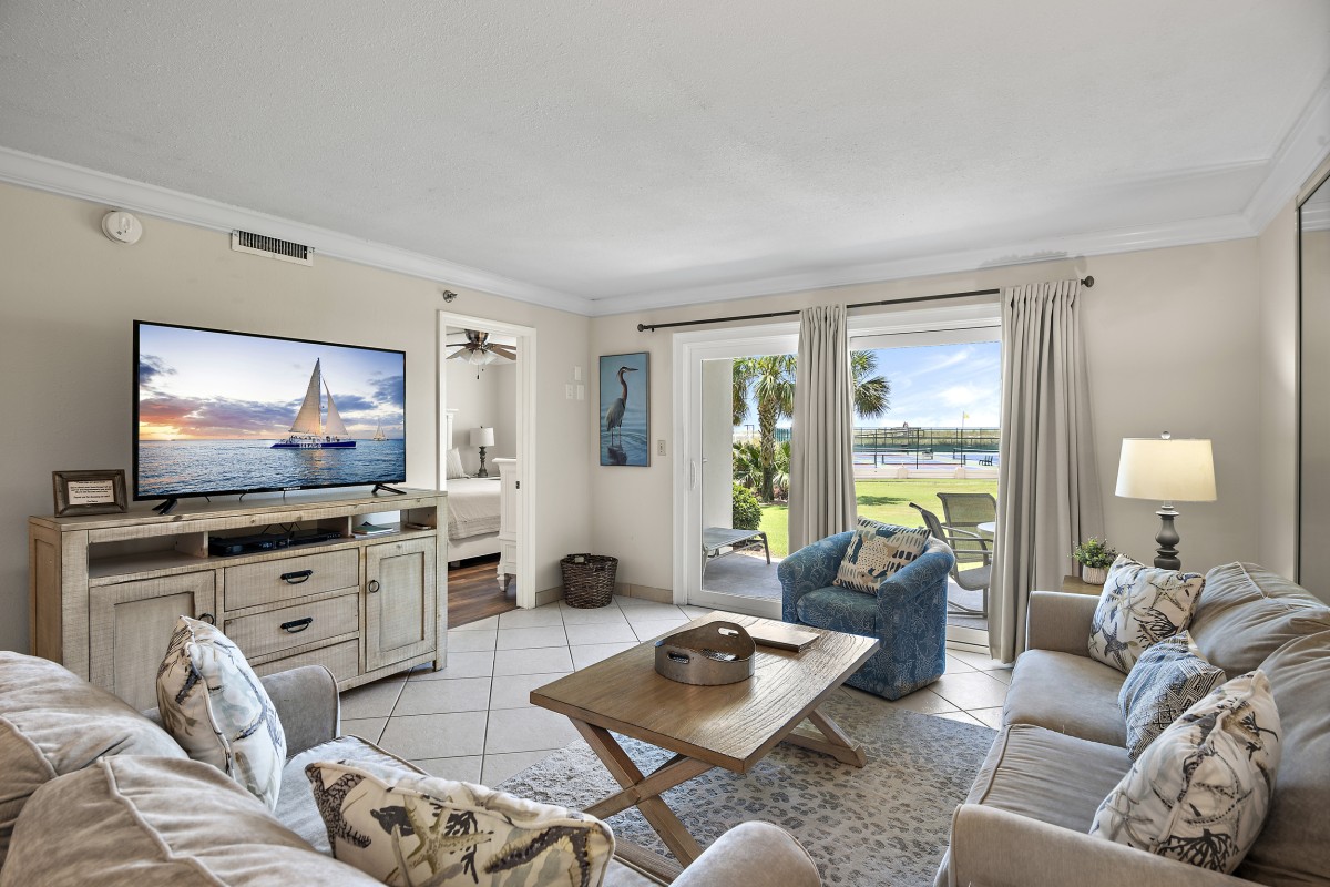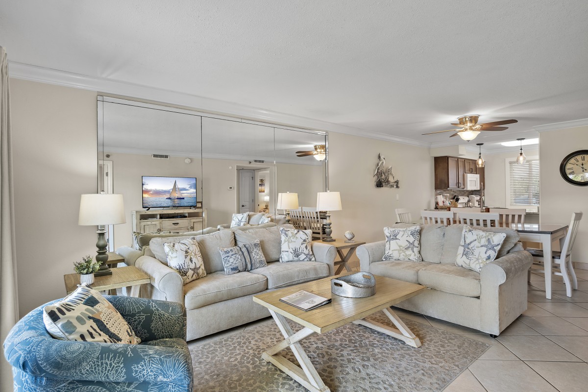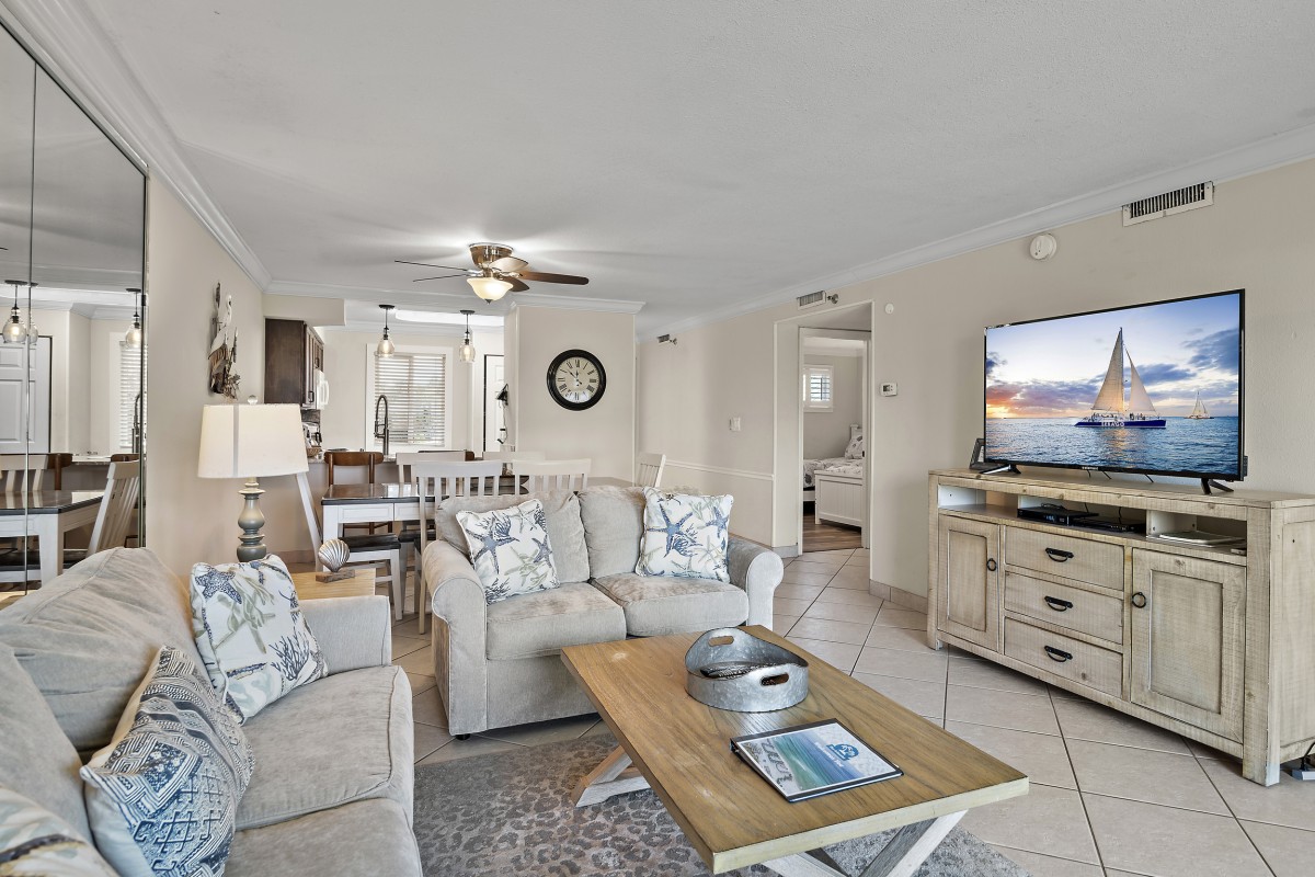 Discover the ideal vacation destination along the stunning Emerald Coast! Our beautiful beachfront condo. Our vacation rental offers a relaxing escape for families or groups of up to 6 guests. Once you step inside this Destin vacation rental to find a bright, freshly painted space featuring elegant crown molding and modern decor. The inviting living room is perfect for relaxation, complete with a new sleeper sofa, love seat, and a 42" flat-screen HDTV for your entertainment. Our rental also includes a washer & dryer!