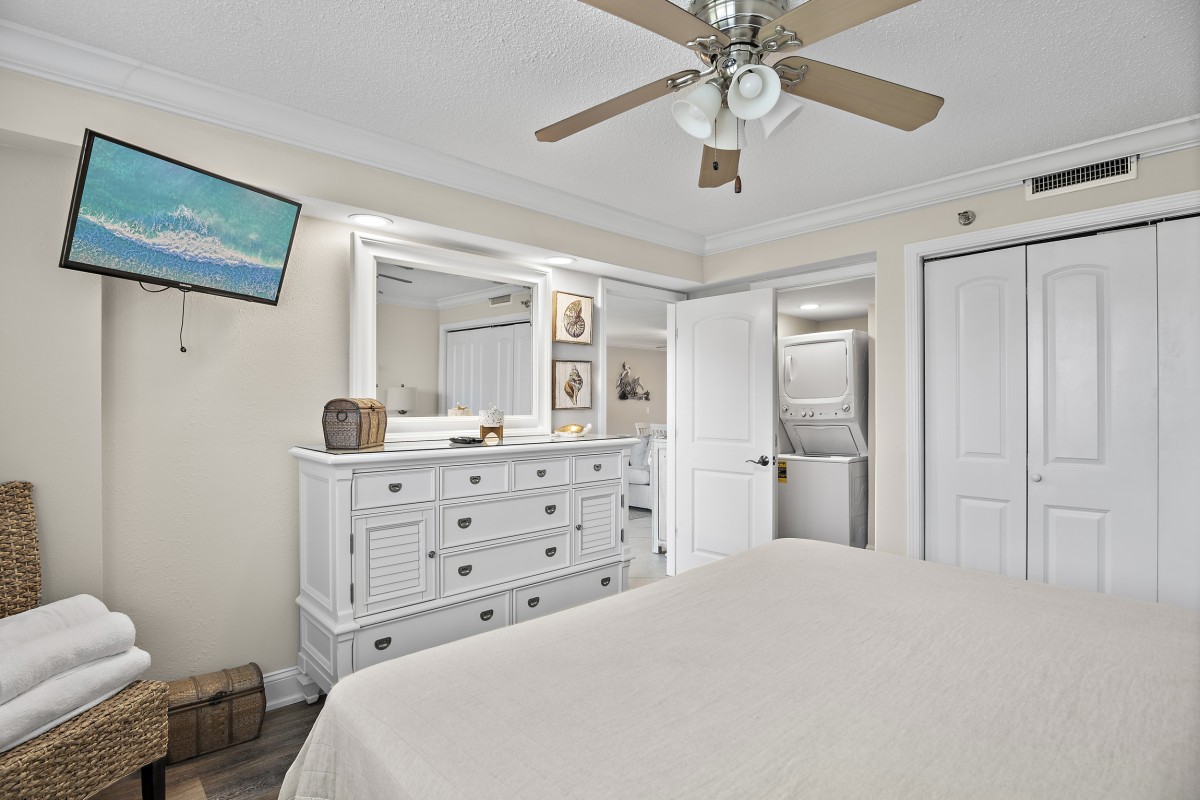 Master Bedroom: Enjoy a restful night in a king bed with a 31” flat-screen HDTV. The private bathroom features a combination tub/shower and a convenient washer/dryer setup.