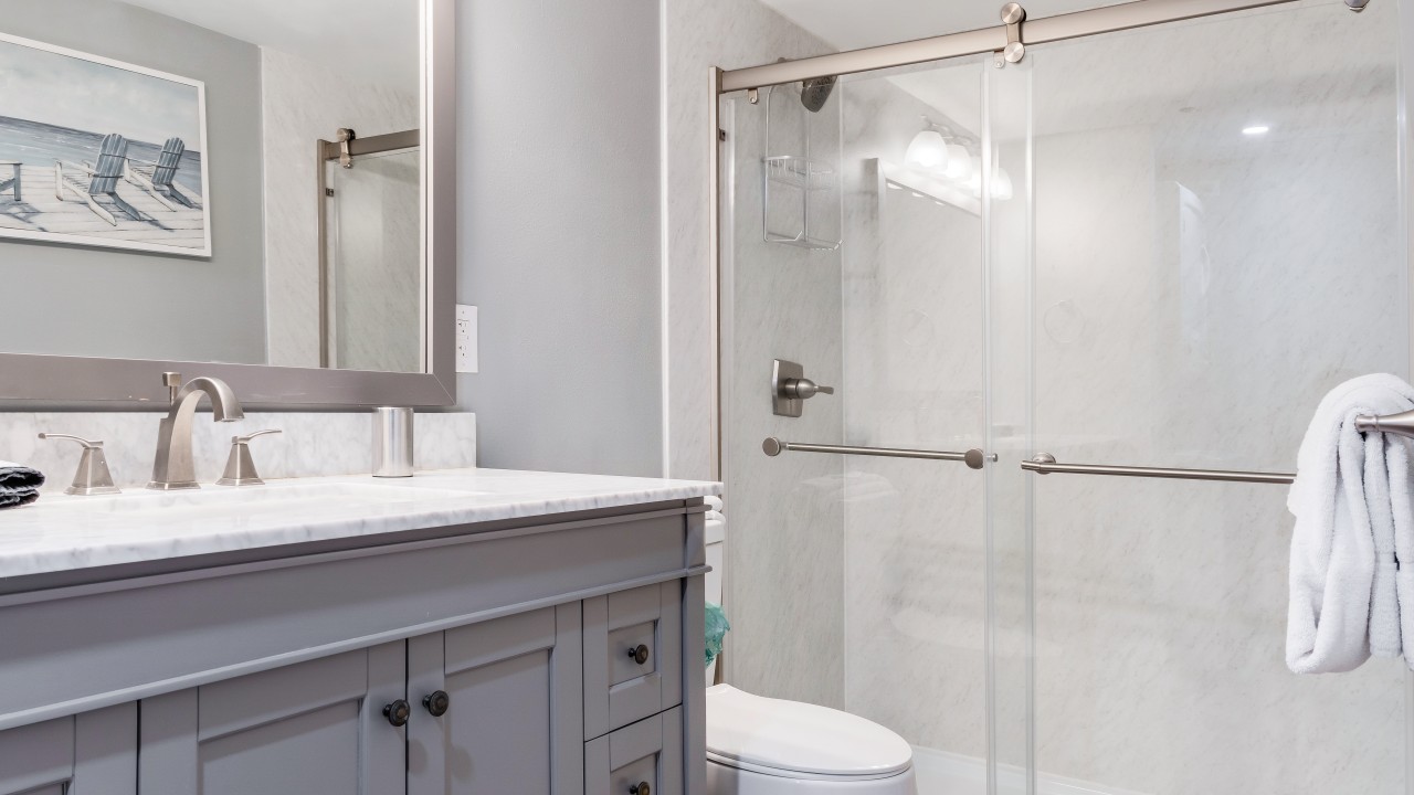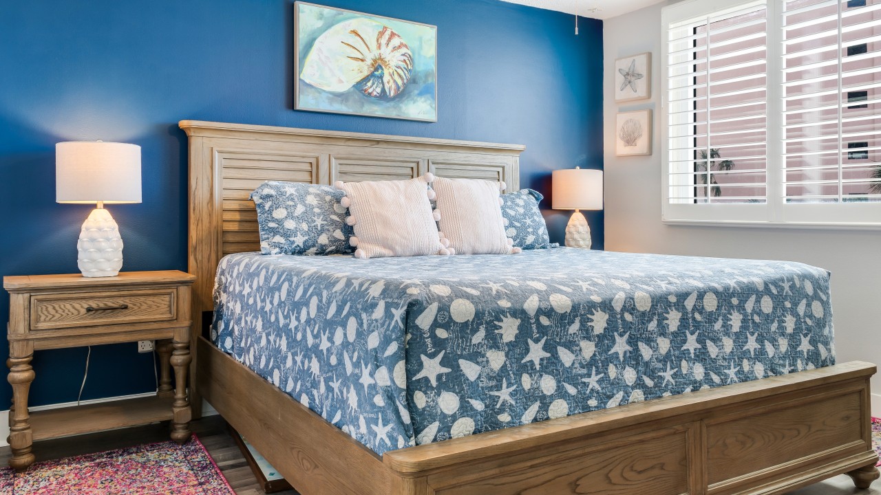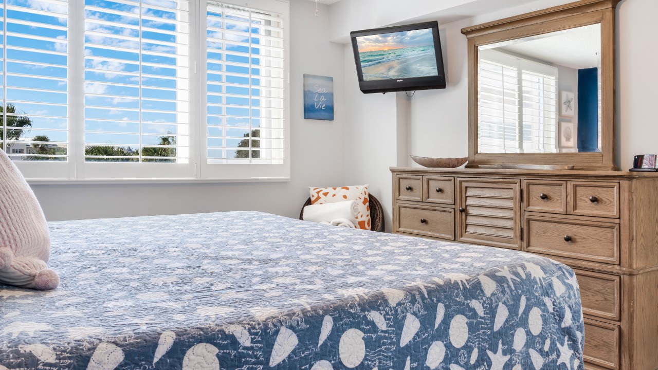 The Primary Bedroom has a King bed with a Tempur-Pedic Mattress and a 26” flat-screen HDTV.