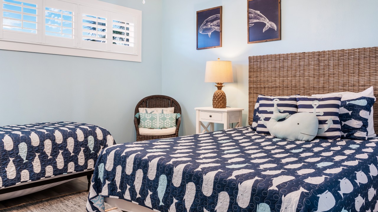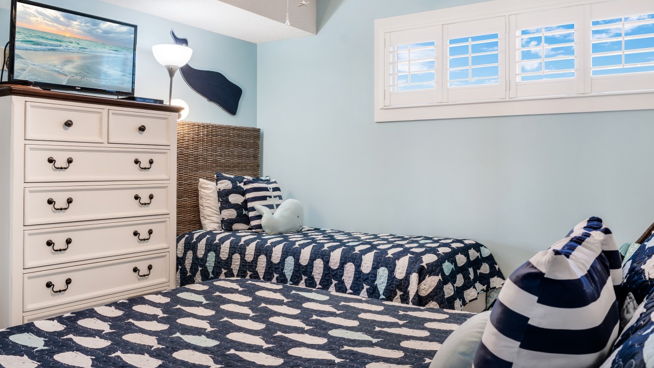 The Secondary Bedroom has a Queen and a Twin bed with a 31” flat-screen HDTV and DVD player.