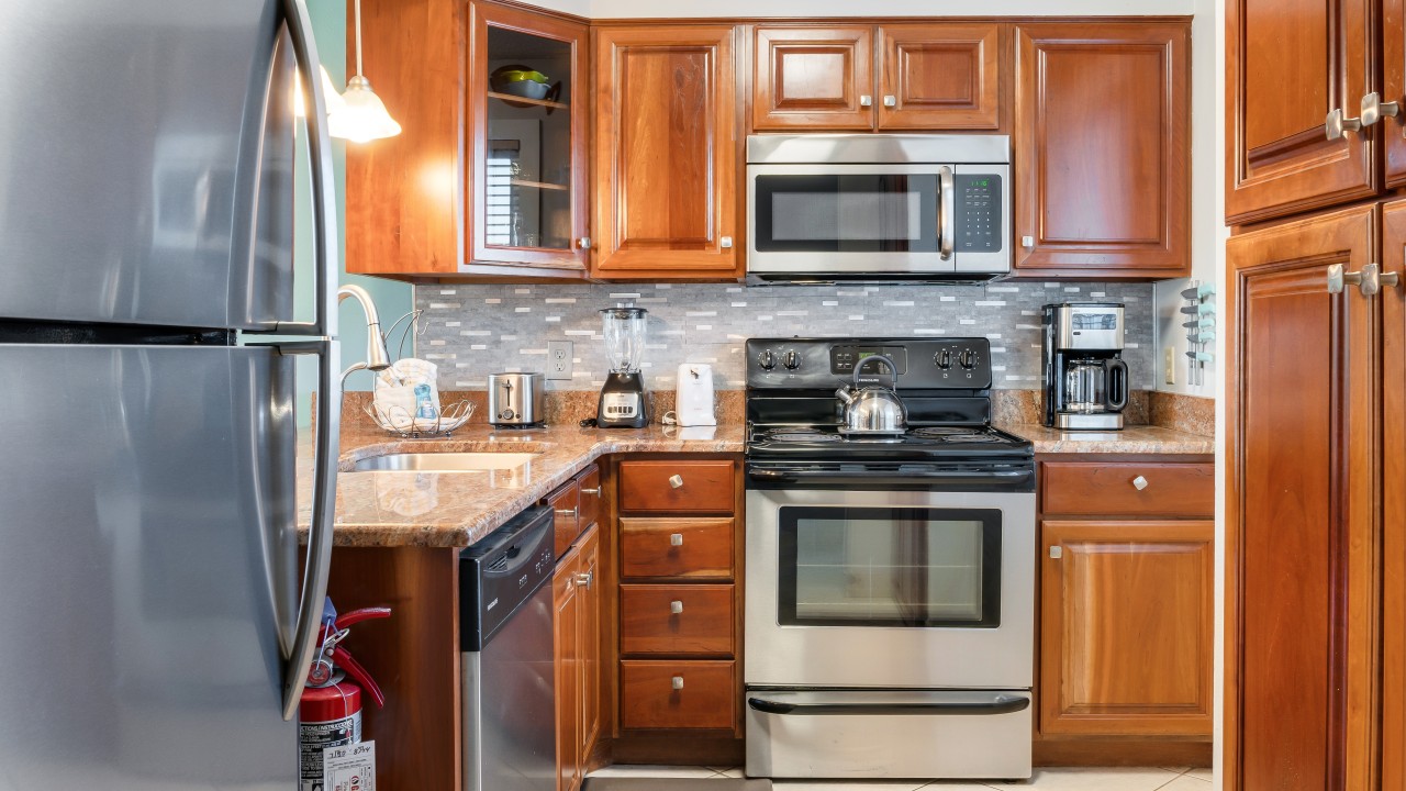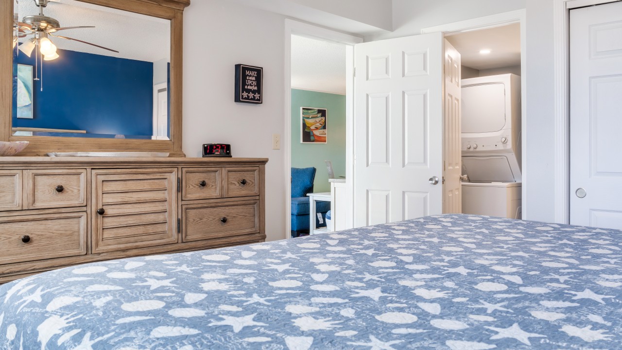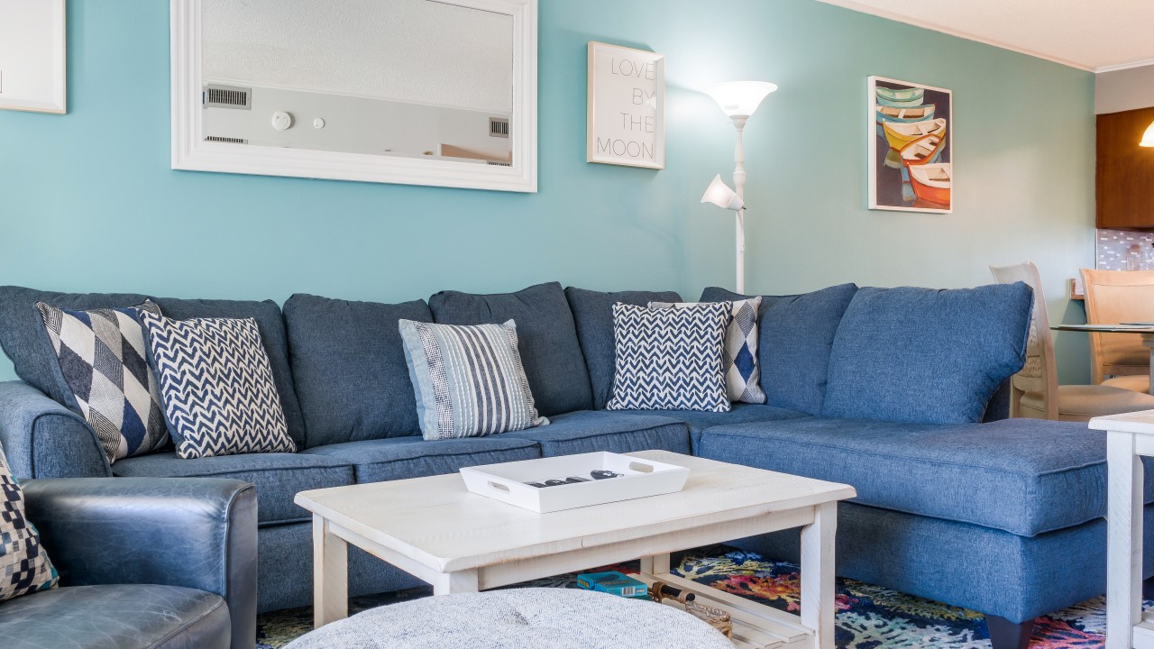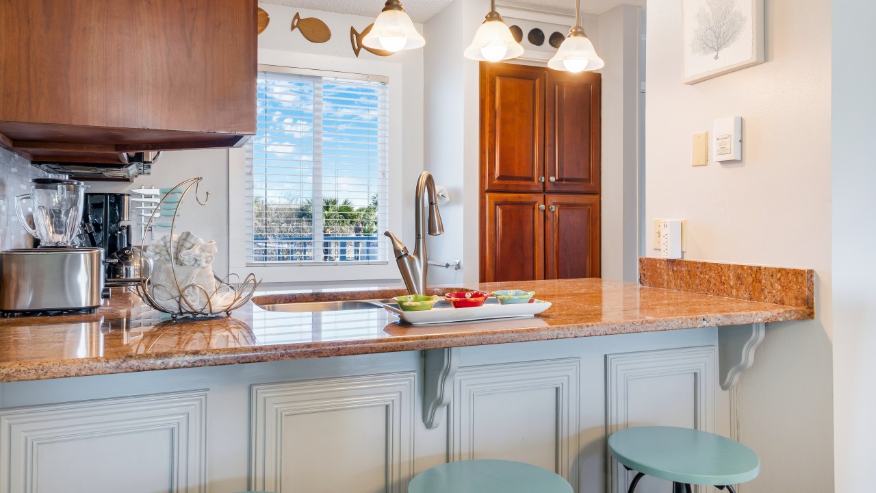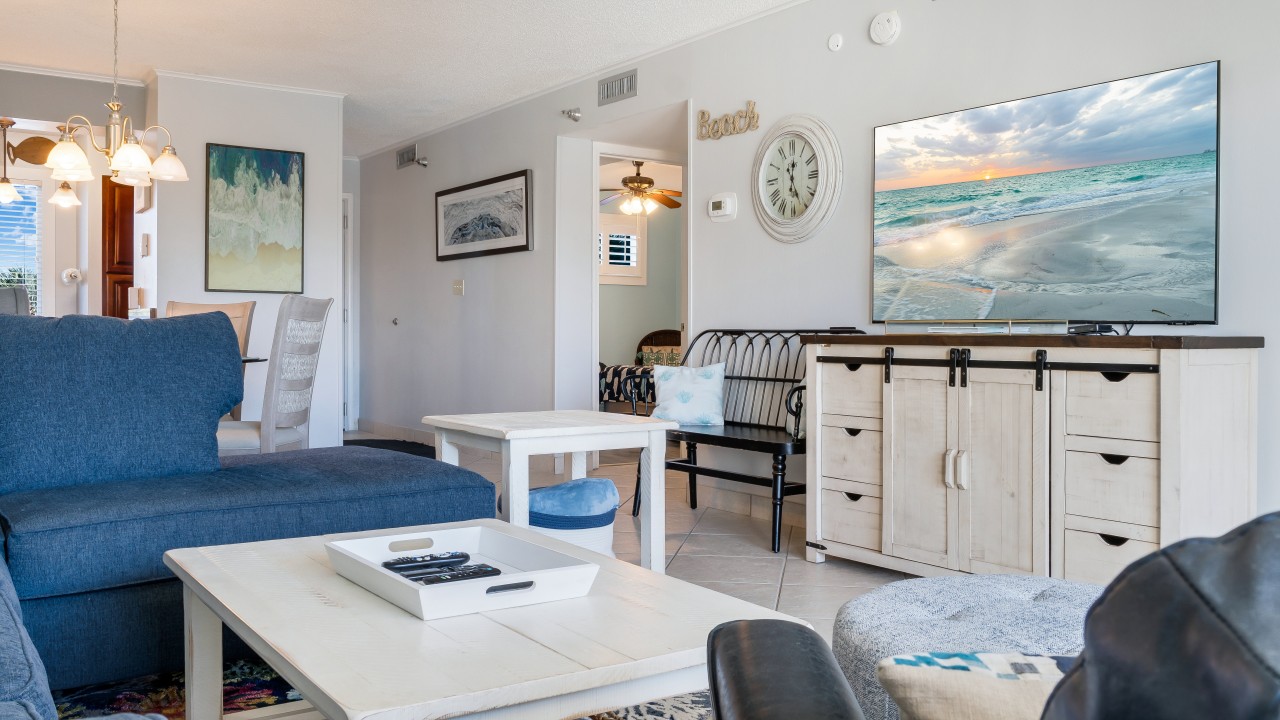Condo 212 is nicely furnished with 3 flat screen TVs, new lighting, ceiling fans in both bedrooms, new furniture in the dining room and bedrooms; plantation shutters in both bedrooms, and a coastal, relaxed feel throughout! The kitchen is complete with a full-size refrigerator, electric stove and oven, and dishwasher. You’ll also have all the dishes, silverware, and accessories you need to prepare your favorite meals.