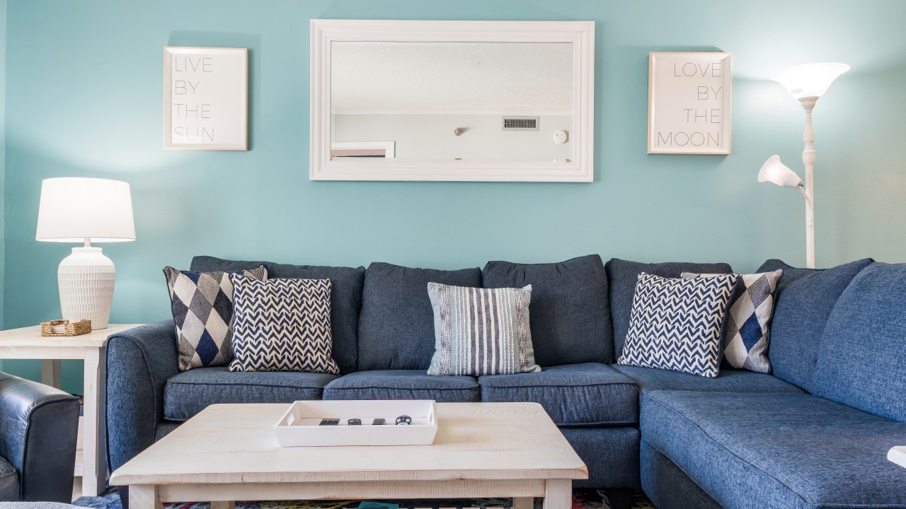 The open Living Room has a 65” flat-screen HDTV, comfortable seating, and a couch that unfolds into a Queen Sofa Sleeper with a Memory Foam Gel Mattress so your extra guests can sleep easy.