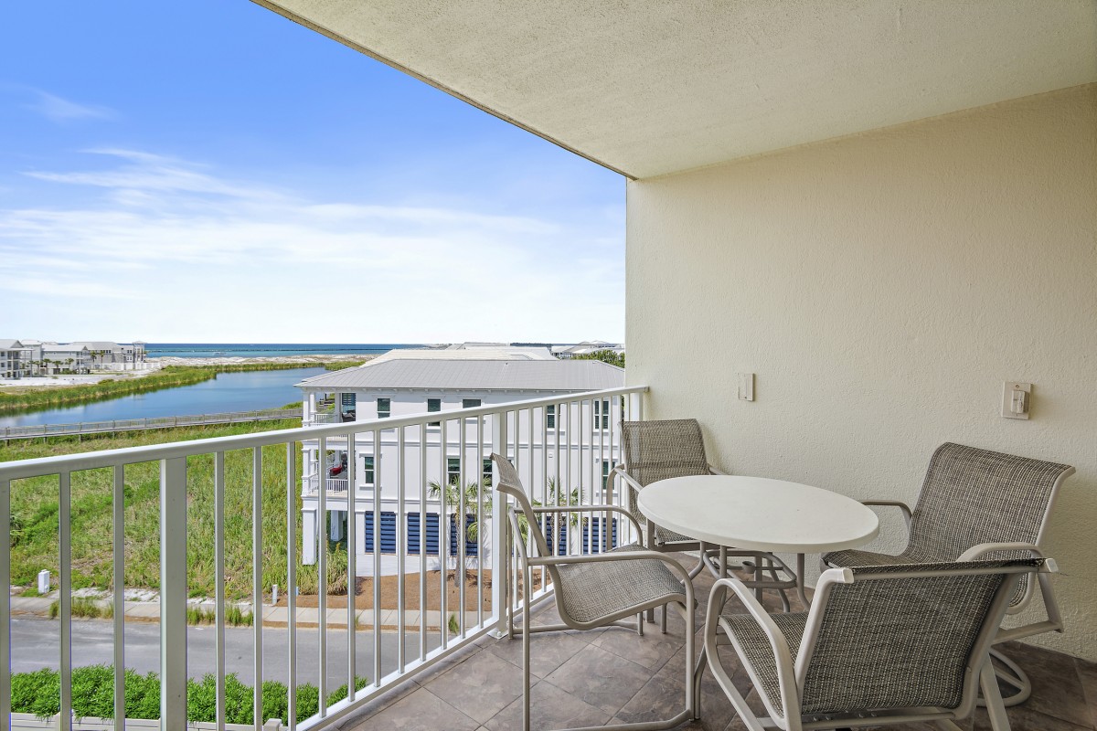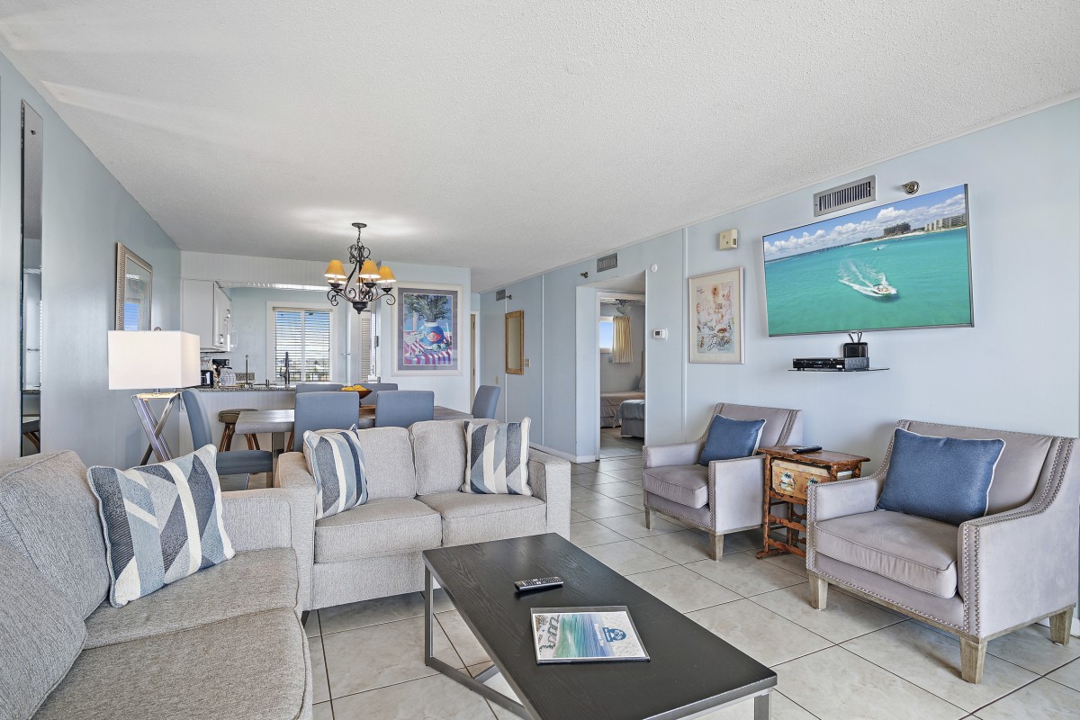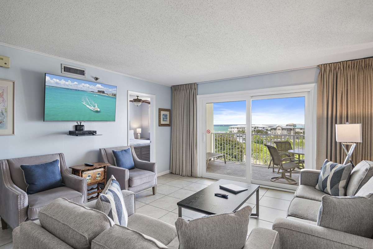 Living Room: Relax in the open living area, beautifully tiled and furnished with a cozy sofa and seating. Unwind after a day in the sun and enjoy quality time together. Step out onto the private balcony to take in incredible views of the water, watching the boats, and capturing the best sunsets Destin has to offer.