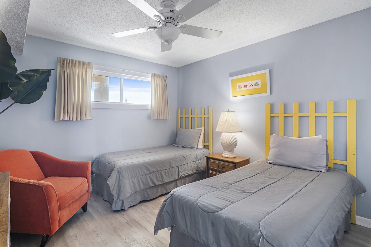 Bedrooms: The master bedroom features a king bed and luxury vinyl plank flooring, and a private bathroom. The guest's bedroom offers two twin beds, with luxury vinyl plank, creating a cozy and inviting space for relaxation.