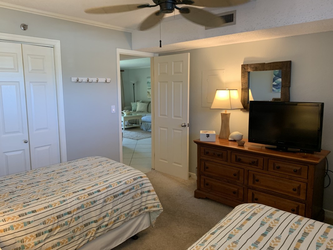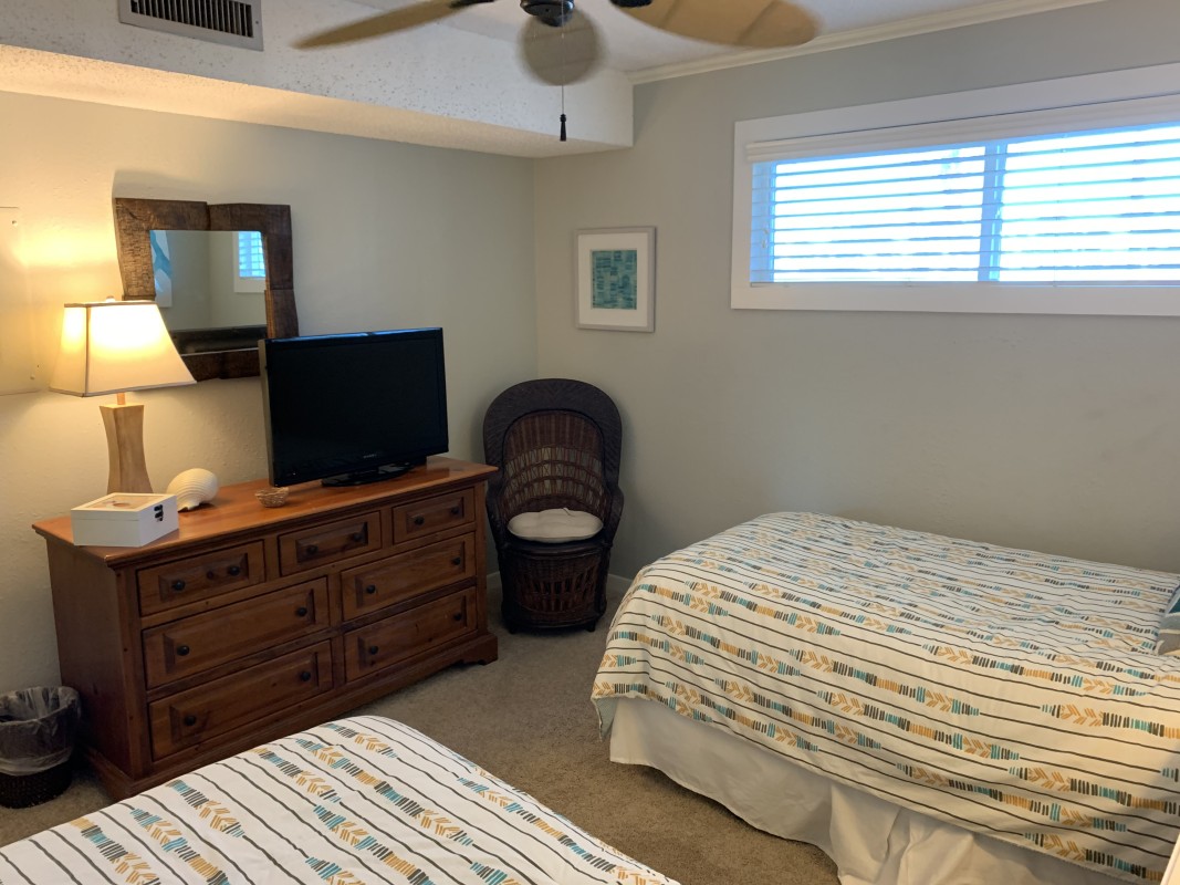 Bedrooms: The master bedroom features a king-size bed with a flat-screen TV and a private bathroom with a convenient tub/shower combo. The guest bedroom has two twin beds and its own flat-screen TV, with easy access to the guest bathroom, also equipped with a tub/shower combo.