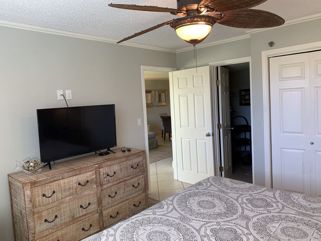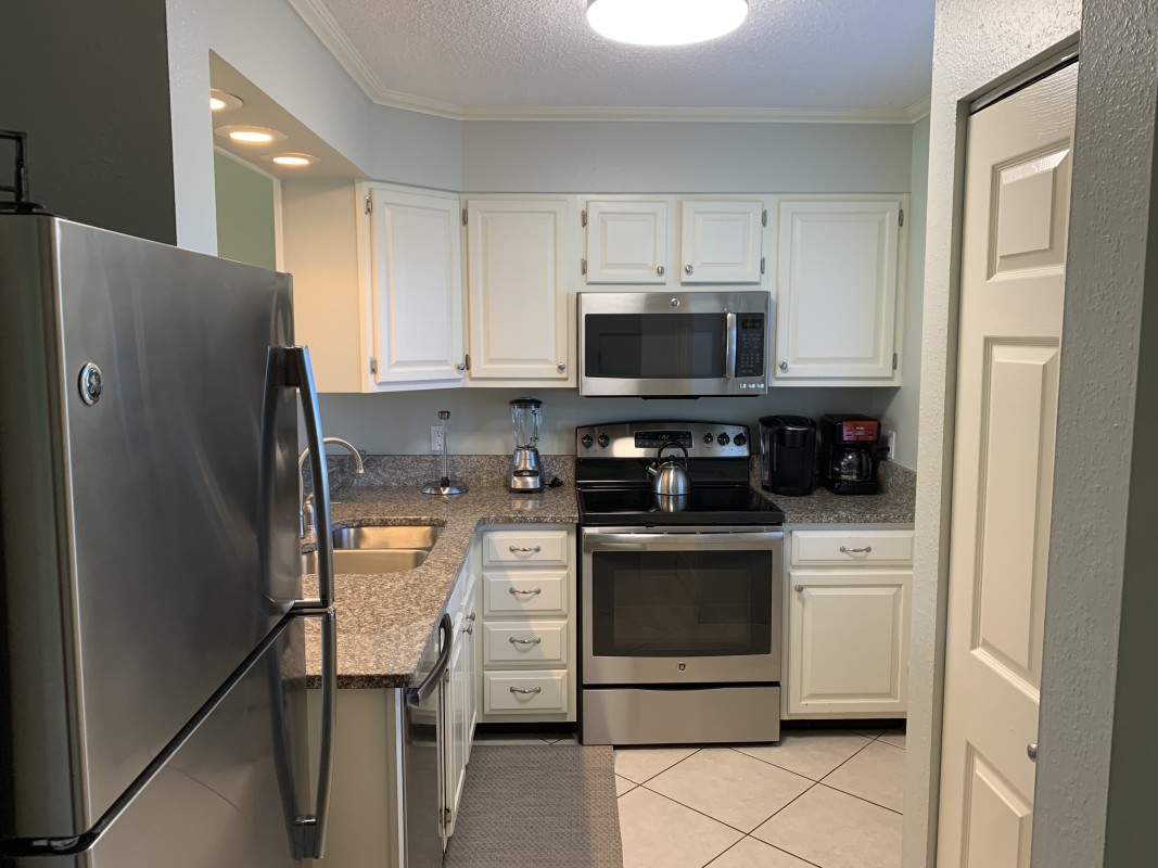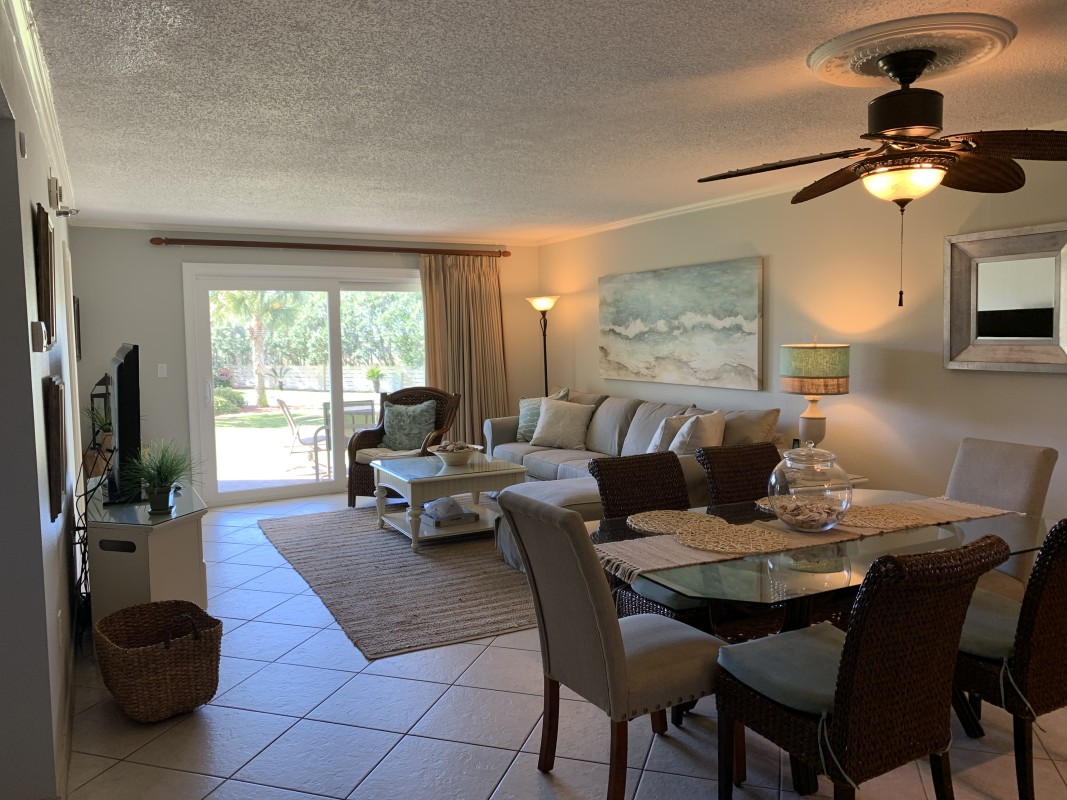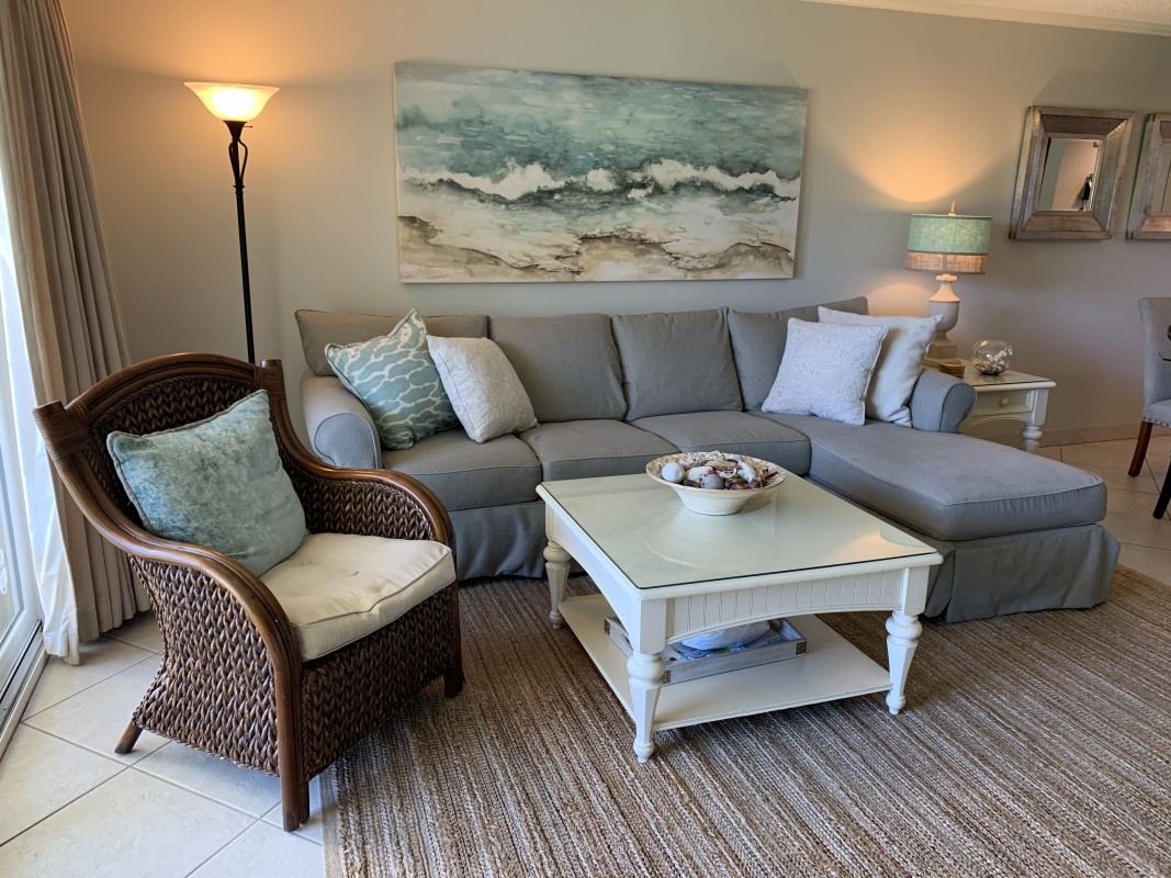 Living Room & Patio Access: Enjoy our living area, where a plush couch that offers a chaise lounge inviting you to kick back and enjoy your favorite movie or catch the big game on the large flat-screen TV. The couch also converts to a queen sleeper sofa, adding additional sleeping arrangements for your vacation. Slide open the doors to your private patio, easy access to the beach, the pool and the grilling area—the ideal place to savor fresh air and relaxation right at your doorstep.